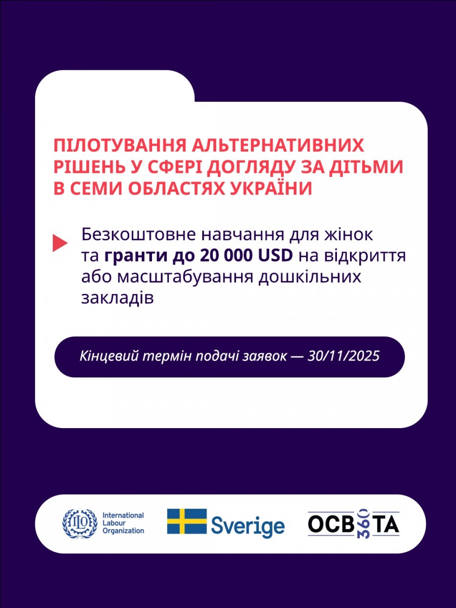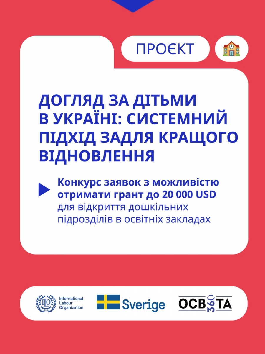 Громадська організація «Освіта 360» оголошує конкурс заявок на участь у пілотуванні альтернативних рішень у сфері догляду за дітьми з можливістю отримати грант до 20 000 доларів США на запуск та розвиток дошкільного підрозділу у школі чи іншому закладі освіти, розташованому в одній з цільових областей України: Одеській, Миколаївській, Дніпропетровській, Запорізькій, Харківській, Сумській та Чернігівській.
