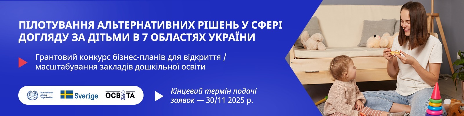 У межах реалізації цього проєкту, ГО “Освіта 360”, як імплементаційний партнер у напрямку пілотування альтернативних рішень у сфері догляду за дітьми в семи областях Україні, оголошує прийом заявок на два грантові конкурси: