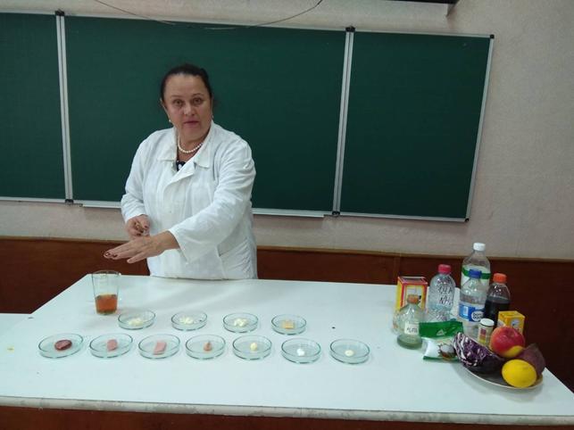 Мар’єнкова С.Є., учителька Тростянецької Філії № 1 І-ІІ ступенів ЗЗСО І-ІІІ ступенів № 5, представила дослід з виготовлення розчину універсального індикатору з відвару червоної капусти та його використання для визначення рН розчинів. Учителька Кам’янського ЗЗСО І-ІІІ ступенів Ахмедова Є.Т. продемонструвала дослідження вмісту карбонатів у харчовій соді, шкаралупі яйця та зубній пасті, яке діти можуть виконати в домашніх умовах. Нескладний експеримент із визначення наявності вітаміну «С» у продуктах харчування допоможе учням навчитися розрізняти корисні для споживання продукти. Дослід учительки ЗЗСО І-ІІІ ступенів № 3 Литвиненко Т.І. щодо виявлення крохмалю у складі харчових продуктів дав змогу порівняти якість продуктів, які можна придбати в магазині та безпосередньо у виробника.